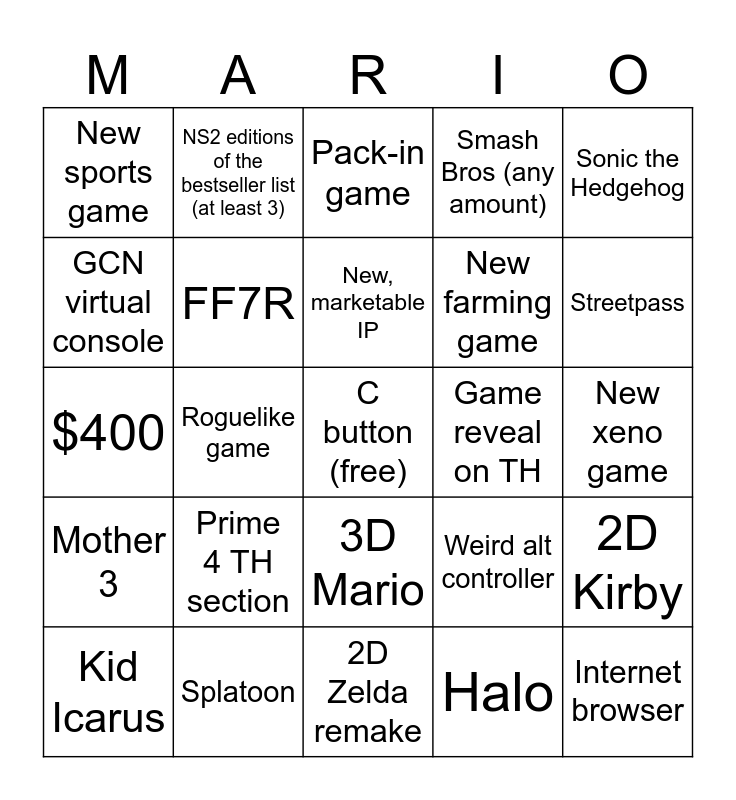 This bingo card has a free space and 24 words: Prime 4 TH section, Splatoon, New, marketable IP, Kid Icarus, Sonic the Hedgehog, New sports game, GCN virtual console, NS2 editions of the bestseller list (at least 3), Game reveal on TH, 3D Mario, New farming game, $400, Weird alt controller, 2D Kirby, FF7R, Halo, New xeno game, Pack-in game, Streetpass, Roguelike game, Internet browser, Mother 3, Smash Bros (any amount) and 2D Zelda remake.