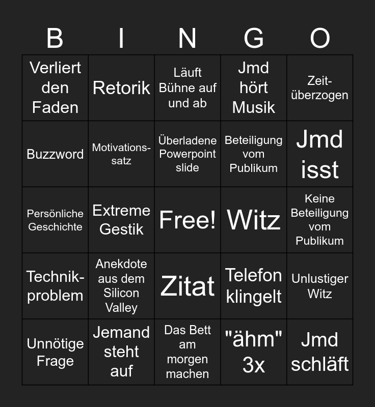 This bingo card has a free space and 24 words: Anekdote aus dem Silicon Valley, Jemand steht auf, Überladene Powerpoint slide, Unnötige Frage, Zeit-überzogen, Verliert den Faden, Buzzword, Retorik, Witz, Zitat, Beteiligung vom Publikum, Persönliche Geschichte, Telefon klingelt, Unlustiger Witz, Motivations-satz, "ähm" 3x, Keine Beteiligung vom Publikum, Läuft Bühne auf und ab, Jmd isst, Extreme Gestik, Jmd schläft, Technik-problem, Jmd hört Musik and Das Bett am morgen machen.