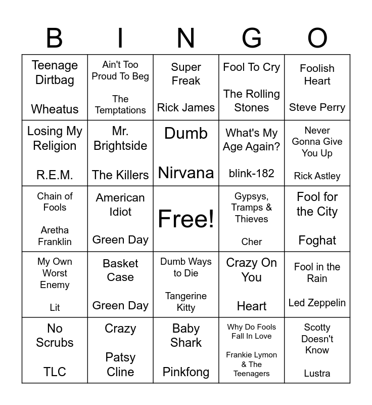 This bingo card has a free space and 65 words: Tall, Tall Trees Alan Jackson, Linger The Cranberries, Fooled Around And Fell In Love Elvin Bishop, Fool in the Rain Led Zeppelin, The Fool On The Hill The Beatles, Can't Help Falling in Love Elvis Presley, Ain't Too Proud To Beg The Temptations, Dumb Love Sean Kingston, Dumb Nirvana, Young Dumb & Broke Khalid, Dumb Ways to Die Tangerine Kitty, Behind Blue Eyes The Who, Fool for the City Foghat, Foolish Heart Steve Perry, What Kind of Fool Am I Rick Springfield, Losing My Religion R.E.M., American Idiot Green Day, Teenage Dirtbag Wheatus, Just A Girl No Doubt, What's My Age Again? blink-182, Basket Case Green Day, My Own Worst Enemy Lit, Fool To Cry The Rolling Stones, Too Much Fun Daryle Singletary, Won't Get Fooled Again The Who, The Joker Steve Miller Band, Baba O'Riley The Who, Pretty Fly (For A White Guy) The Offspring, Scotty Doesn't Know Lustra, You May Be Right Billy Joel, No Scrubs TLC, Oops!...I Did It Again Britney Spears, 1985 Bowling For Soup, Crazy Gnarls Barkley, Crazy On You Heart, Crazy Patsy Cline, Crazy Little Thing Called Love Queen, Chain of Fools Aretha Franklin, Why Do Fools Fall In Love Frankie Lymon & The Teenagers, Fool's Hall of Fame Johnny Cash, Mr. Brightside The Killers, I Am A Gummy Bear Gummibar, Gypsys, Tramps & Thieves Cher, The Tears Of A Clown Smokey Robinson & The Miracles, You're So Vain Carly Simon, Joker And The Thief Wolfmother, Never Gonna Give You Up Rick Astley, Whopper Whopper Burger King, Amish Paradise Weird Al Yankovic, White & Nerdy Weird Al Yankovic, Wii Turn Up Murcy, Mad World Gary Jules, Tip Toe Thru the Tulips With Me Tiny Tim, Baby Shark Pinkfong, The HampsterDance Song Hampton The Hampster, The Less I Know The Better Tame Impala, Queen Of Hearts Juice Newton, Super Freak Rick James, Psycho Killer Talking Heads, Superstition Stevie Wonder, Le Freak CHIC, The Fool Lee Ann Womack, Good Luck, Babe! Chappell Roan, Lesson In Leavin' Jo Dee Messina and Jackson Johnny Cash, June Carter.