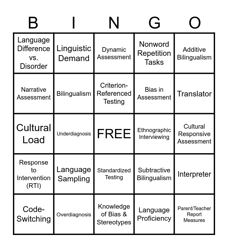 This bingo card has a free space and 24 words: Language Sampling, Overdiagnosis, Criterion-Referenced Testing, Code-Switching, Additive Bilingualism, Language Difference vs. Disorder, Narrative Assessment, Linguistic Demand, Ethnographic Interviewing, Standardized Testing, Bias in Assessment, Cultural Load, Subtractive Bilingualism, Interpreter, Bilingualism, Language Proficiency, Cultural Responsive Assessment, Dynamic Assessment, Translator, Underdiagnosis, Parent/Teacher Report Measures, Response to Intervention (RTI), Nonword Repetition Tasks and Knowledge of Bias & Stereotypes.