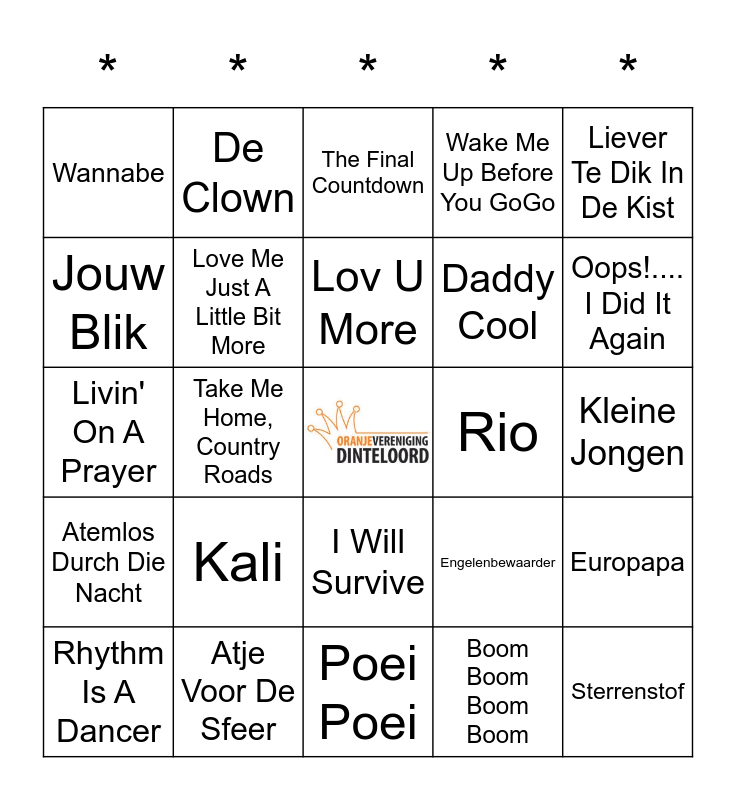 This bingo card has a free space and 81 words: Tarzan Boy, Terug In De tijd, The Final Countdown, Thunderstruck, Una Aploma Blanca, Unwritten, Van Brabant naar Bordeaux, Van Goes Tot Purmerend, Vanavond (uit m'n Bol), Vette Boeren, Vier Zomers Lang, Vlieg Met Me Mee, Wake Me Up Before You GoGo, Wannabe, In De Blote Kont, Jouw Blik, Juffrouw Toos, Kali, Kind Van De Duivel, Kleine Jongen, Liberte, Liever Te Dik In De Kist, Livin' On A Prayer, Lov U More, Love Me Just A Little Bit More, Maar Vanavond Heb Ik Hoofdpijn, Mama Laudaaa, Mon Amour, Never Gonna Gibe You Up, Ons Moeder Zeej Nog, Oops!.... I Did It Again, Oya LeLe, Poei Poei, Ratata, Rhythm Is A Dancer, Rio, Rititi, Schudden, Sexy Als Ik Dans, Single Ladies (Put A Ring On It), Sterrenstof, Sugardaddy, Summer Of '69, Sweet Caroline, Take Me Home, Country Roads, Dat Interesseert Me Echt Geen Ene Reet, De Clown, De Toreador, Deurdonderen, Dreams (will Come Alive), Engelenbewaarder, Europapa, Even Aan Mijn Moeder Vragen, Everybody, Get Ready, Gimme Gimme Gimme, Heb Je Even Voor Mij, Helikopter, Huisfeestje, I Was Made For Lovin' You, I Will Survive, Ich Bin Wie Du, Ik Moet Nog Wat Jaren Mee, Waterloo, Why Tell Me Why, YMCA, You're The Greatest Lover, Zoet, Zout, Zuur, Aan de Amsterdamse Grachten, Als De Zon Schijnt, Amalia, Atemlos Durch Die Nacht, Atje Voor De Sfeer, Bad Romance, Barbie Girl, Blikkendag, Bon Gepakt, Boom Boom Boom Boom, Brabant, Daddy Cool and Dans Je De Hele Nacht Met Mij.