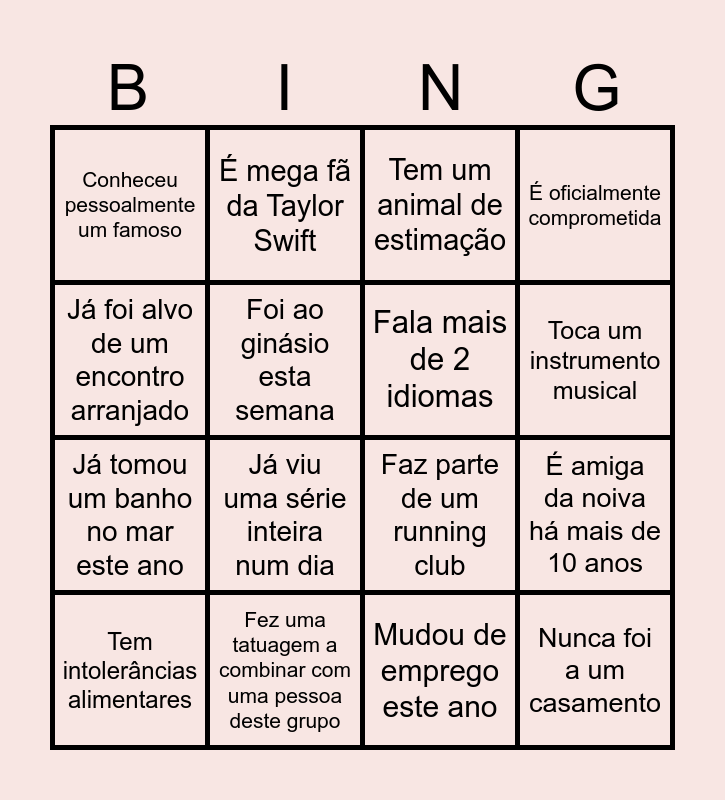 This bingo card has 21 words: Fez uma tatuagem a combinar com uma pessoa deste grupo, Adora máscaras faciais, É mega fã da Taylor Swift, Guincha quando ri, Mudou de emprego este ano, Fala mais de 2 idiomas, Conheceu pessoalmente um famoso, Tem um animal de estimação, Faz parte de um running club, Toca um instrumento musical, Já tomou um banho no mar este ano, É oficialmente comprometida, Nunca foi a um casamento, É emigrante, Foi ao ginásio esta semana, Usa óculos ou lentes de contacto, Tem intolerâncias alimentares, Já viu uma série inteira num dia, Já foi alvo de um encontro arranjado, É amiga da noiva há mais de 10 anos and Não consegue viver sem café.