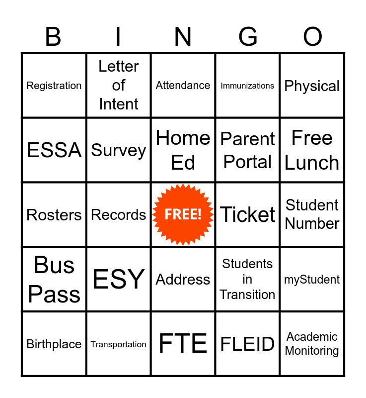 This bingo card has a free space and 35 words: Florida Reports, Focus, PMP, Survey, Address, Immunizations, ESSA, Enrollment, Home Ed, Scheduling, Rosters, Physical, Withdraw, FASTER, Registration, Ticket, FLEID, Records, Bus Pass, Academic Monitoring, Students in Transition, Birthplace, myStudent, Transportation, Attendance, Free Lunch, Duplicates, Emergency Card, Parent Portal, Student Number, McKinney-Vento, FTE, ESY, Letter of Intent and Letter of Termination.