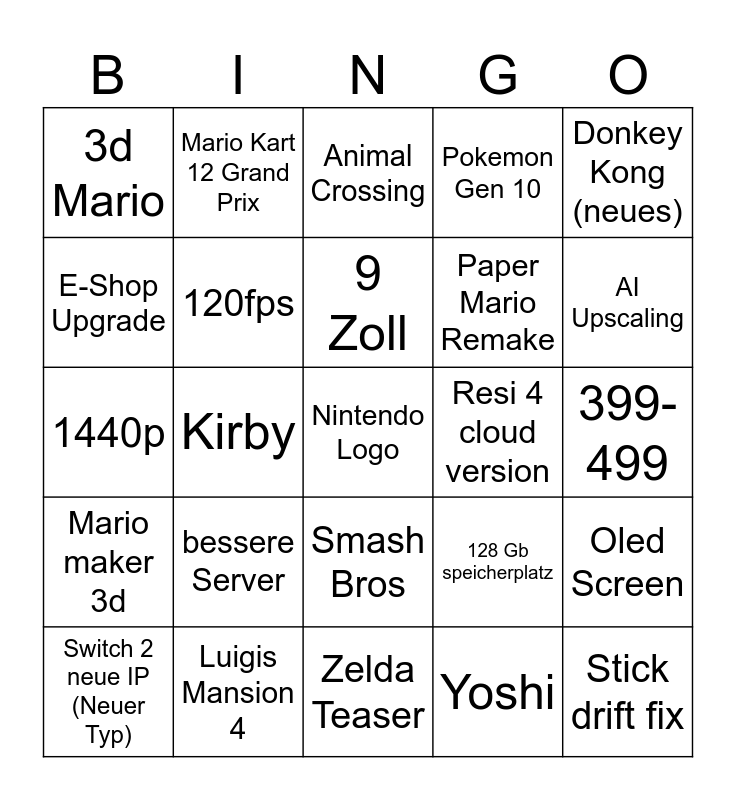 This bingo card has a free space and 24 words: Switch 2 neue IP (Neuer Typ), bessere Server, 9 Zoll, Yoshi, Donkey Kong (neues), 3d Mario, Mario Kart 12 Grand Prix, Animal Crossing, Resi 4 cloud version, 399-499, 1440p, 120fps, 128 Gb speicherplatz, Oled Screen, E-Shop Upgrade, Luigis Mansion 4, Zelda Teaser, Pokemon Gen 10, AI Upscaling, Mario maker 3d, Kirby, Smash Bros, Paper Mario Remake and Stick drift fix.