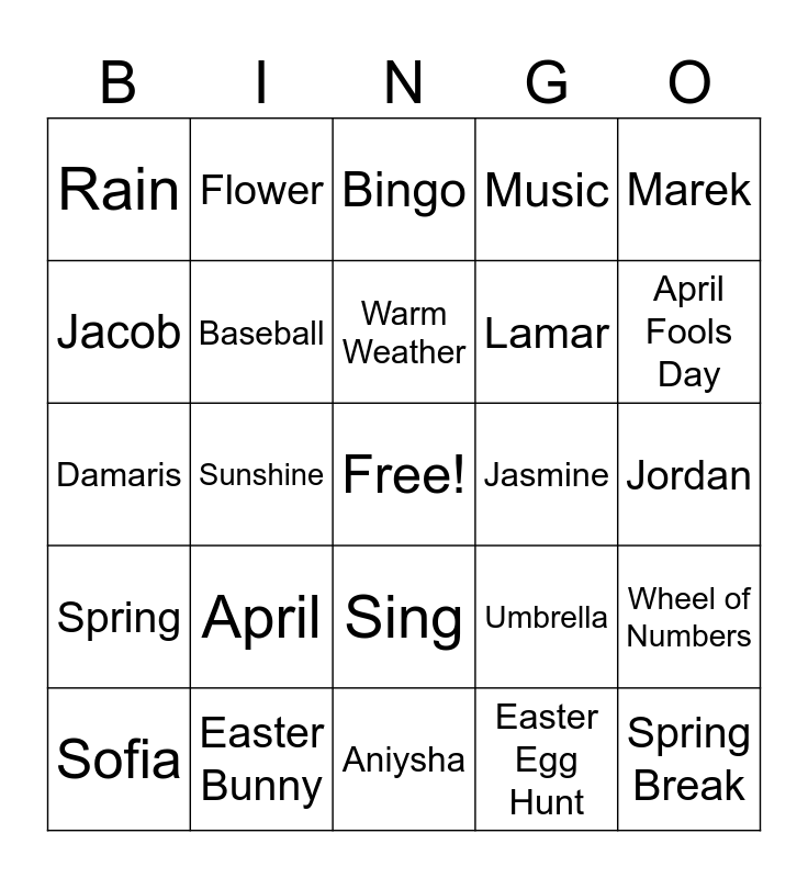This bingo card has a free space and 24 words: April, Easter Bunny, Warm Weather, Sofia, Marek, Rain, Jacob, Flower, Jasmine, Sing, Lamar, Damaris, Umbrella, Wheel of Numbers, Baseball, Easter Egg Hunt, Jordan, Bingo, April Fools Day, Sunshine, Spring Break, Spring, Music and Aniysha.
