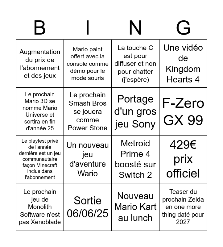 This bingo card has 16 words: Sortie 06/06/25, 429€ prix officiel, La touche C est pour diffuser et non pour chatter (j'espère), Augmentation du prix de l'abonnement et des jeux, Le playtest privé de l'année dernière est un jeu communautaire façon Minecraft inclus dans l'abonnement, Mario paint offert avec la console comme démo pour le mode souris, Metroid Prime 4 boosté sur Switch 2, Nouveau Mario Kart au lunch, Le prochain Mario 3D se nomme Mario Universe et sortira en fin d'année 25, Le prochain Smash Bros se jouera comme Power Stone, Le prochain jeu de Monolith Software n'est pas Xenoblade, Une vidéo de Kingdom Hearts 4, Un nouveau jeu d'aventure Wario, F-Zero GX 99, Portage d'un gros jeu Sony and Teaser du prochain Zelda en one more thing daté pour 2027.
