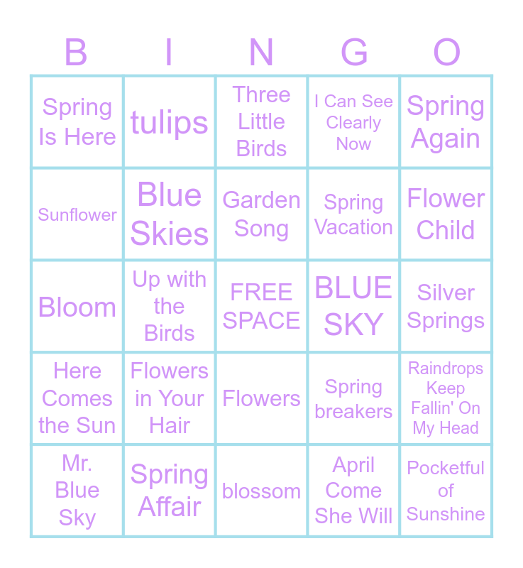 This bingo card has a free space and 24 words: Mr. Blue Sky, Flowers in Your Hair, Garden Song, April Come She Will, Spring Again, Spring Is Here, tulips, Three Little Birds, BLUE SKY, Silver Springs, Bloom, Blue Skies, Spring breakers, Raindrops Keep Fallin' On My Head, Sunflower, Spring Affair, blossom, I Can See Clearly Now, Flower Child, Here Comes the Sun, Up with the Birds, Flowers, Spring Vacation and Pocketful of Sunshine.