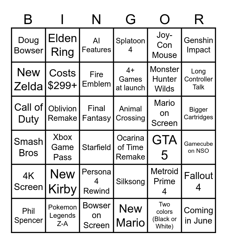 This bingo card has 36 words: Silksong, Persona 4 Rewind, New Mario, New Zelda, Smash Bros, Animal Crossing, Costs $299+, Bowser on Screen, Joy-Con Mouse, Metroid Prime 4, Long Controller Talk, Splatoon 4, Fallout 4, Oblivion Remake, 4+ Games at launch, Doug Bowser, 4K Screen, Mario on Screen, Call of Duty, AI Features, Final Fantasy, Xbox Game Pass, Ocarina of Time Remake, Starfield, GTA 5, Elden Ring, Monster Hunter Wilds, Pokemon Legends Z-A, Fire Emblem, Genshin Impact, Coming in June, Phil Spencer, Gamecube on NSO, Bigger Cartridges, New Kirby and Two colors (Black or White).