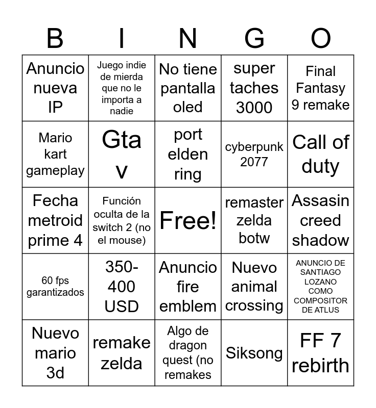 This bingo card has a free space and 24 words: 350-400 USD, remake zelda, port elden ring, Nuevo mario 3d, Final Fantasy 9 remake, Anuncio nueva IP, Mario kart gameplay, Juego indie de mierda que no le importa a nadie, remaster zelda botw, Anuncio fire emblem, cyberpunk 2077, Fecha metroid prime 4, Nuevo animal crossing, ANUNCIO DE SANTIAGO LOZANO COMO COMPOSITOR DE ATLUS, Gta v, Siksong, Assasin creed shadow, No tiene pantalla oled, Call of duty, Función oculta de la switch 2 (no el mouse), FF 7 rebirth, 60 fps garantizados, super taches 3000 and Algo de dragon quest (no remakes.