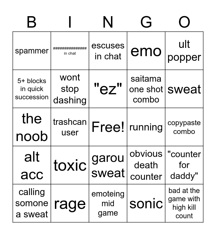 This bingo card has a free space and 24 words: toxic, rage, "ez", calling somone a sweat, ult popper, spammer, 5+ blocks in quick succession, ############### in chat, running, garou sweat, saitama one shot combo, the noob, obvious death counter, "counter for daddy", wont stop dashing, sonic, copypaste combo, escuses in chat, sweat, trashcan user, bad at the game with high kill count, alt acc, emo and emoteing mid game.