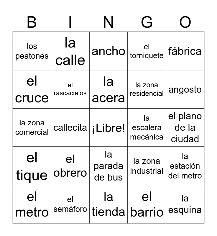 This bingo card has a free space and 24 words: el obrero, el semáforo, la acera, el metro, fábrica, los peatones, el cruce, la calle, la escalera mecánica, la parada de bus, la zona residencial, la zona comercial, la zona industrial, la estación del metro, el rascacielos, el barrio, el plano de la ciudad, ancho, angosto, callecita, la esquina, el tique, el torniquete and la tienda.