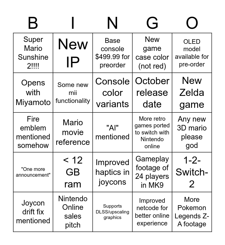 This bingo card has a free space and 24 words: < 12 GB ram, Nintendo Online sales pitch, Console color variants, Joycon drift fix mentioned, OLED model available for pre-order, Super Mario Sunshine 2!!!!, Opens with Miyamoto, New IP, More retro games ported to switch with Nintendo online, Improved haptics in joycons, October release date, Fire emblem mentioned somehow, Gameplay footage of 24 players in MK9, 1-2-Switch-2, Some new mii functionality, Improved netcode for better online experience, Any new 3D mario please god, Base console $499.99 for preorder, New Zelda game, Mario movie reference, More Pokemon Legends Z-A footage, "One more announcement", New game case color (not red) and Supports DLSS/upscaling graphics.