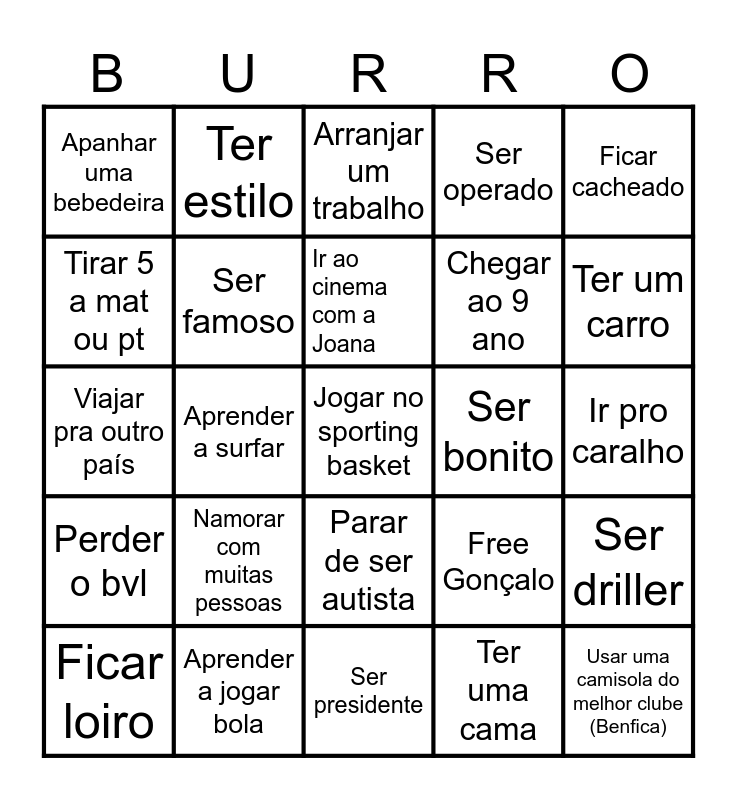This bingo card has 25 words: Namorar com muitas pessoas, Ser presidente, Ir ao cinema com a Joana, Ficar loiro, Ficar cacheado, Apanhar uma bebedeira, Tirar 5 a mat ou pt, Ter estilo, Ser bonito, Parar de ser autista, Chegar ao 9 ano, Viajar pra outro país, Free Gonçalo, Ser driller, Ser famoso, Usar uma camisola do melhor clube (Benfica), Ir pro caralho, Arranjar um trabalho, Ter um carro, Aprender a surfar, Jogar no sporting basket, Aprender a jogar bola, Perder o bvl, Ser operado and Ter uma cama.