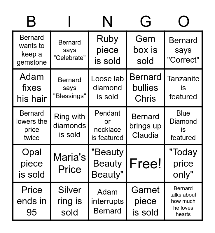 This bingo card has 25 words: Maria's Price, Adam interrupts Bernard, Loose lab diamond is sold, Price ends in 95, Bernard says "Correct", Bernard wants to keep a gemstone, Adam fixes his hair, Bernard says "Celebrate", Bernard brings up Claudia, "Beauty Beauty Beauty", Bernard bullies Chris, Bernard lowers the price twice, Free!, "Today price only", Bernard says "Blessings", Bernard talks about how much he loves hearts, Blue Diamond is featured, Ruby piece is sold, Tanzanite is featured, Ring with diamonds is sold, Pendant or necklace is featured, Silver ring is sold, Opal piece is sold, Gem box is sold and Garnet piece is sold.