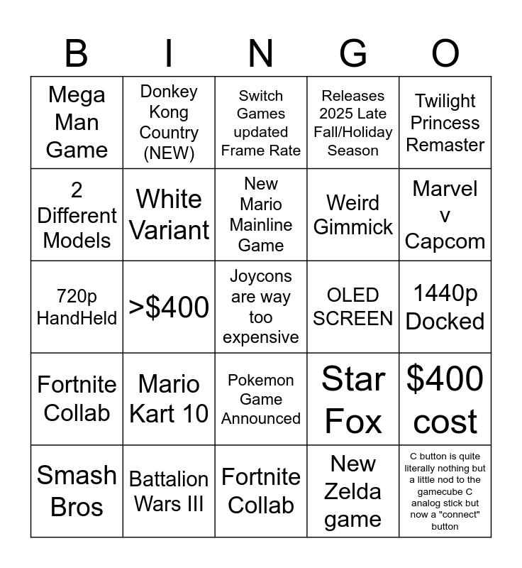 This bingo card has a free space and 24 words: Smash Bros, Mario Kart 10, New Mario Mainline Game, New Zelda game, Twilight Princess Remaster, Mega Man Game, Donkey Kong Country (NEW), Switch Games updated Frame Rate, OLED SCREEN, 1440p Docked, 720p HandHeld, White Variant, Star Fox, $400 cost, 2 Different Models, Battalion Wars III, Fortnite Collab, Releases 2025 Late Fall/Holiday Season, Marvel v Capcom, Fortnite Collab, >$400, Pokemon Game Announced, Weird Gimmick and C button is quite literally nothing but a little nod to the gamecube C analog stick but now a "connect" button.