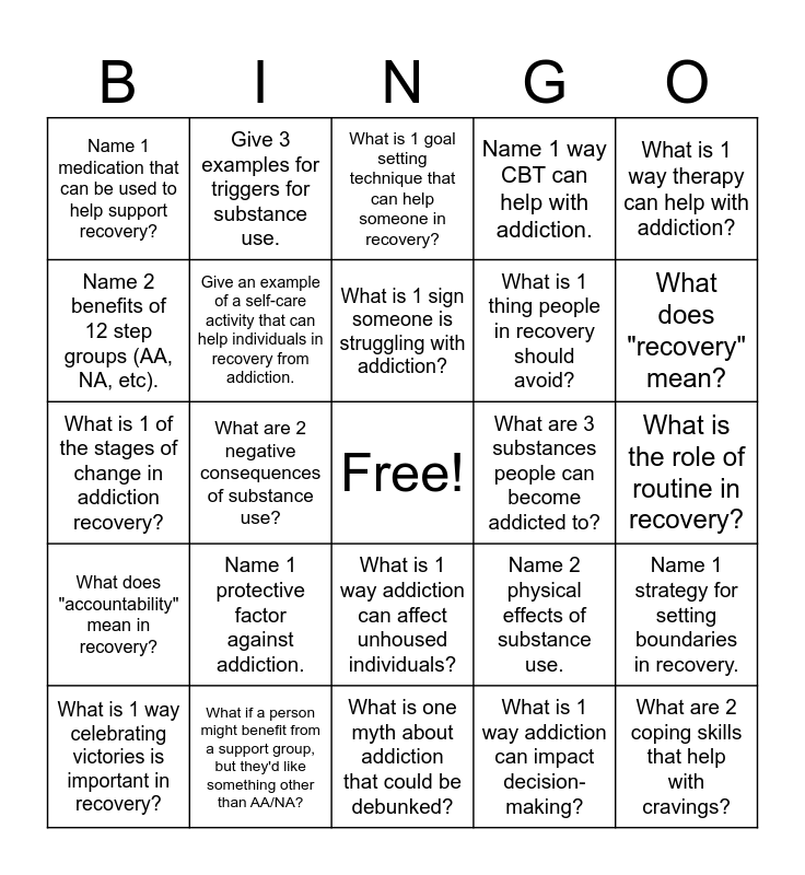 This bingo card has a free space and 52 words: Name 3 characteristics of substance use disorder., What are 2 coping skills that help with cravings?, List 2 common co-occuring disorders., What is one myth about addiction that could be debunked?, Name 1 protective factor against addiction., List 3 risk factors for addiction., Give 3 examples for triggers for substance use., What is 1 way trauma and substance use can be connected?, Name 2 benefits of 12 step groups (AA, NA, etc)., Name 1 way stigma can affect individuals struggling with addiction?, Give an example of a self-care activity that can help individuals in recovery from addiction., What is 1 way to support someone in recovery?, Name 1 strategy for setting boundaries in recovery., Name 2 physical effects of substance use., What is 1 behavioral symptom of addiction?, What does "sobriety" mean?, What is 1 sign someone is struggling with addiction?, What are 3 substances people can become addicted to?, What is 1 common withdrawal symptom from alcohol?, What is 1 way therapy can help with addiction?, What are 2 negative consequences of substance use?, What is 1 way addiction can impact decision-making?, Name 1 medication that can be used to help support recovery?, What is 1 thing people in recovery should avoid?, What role does nutrition play in recovery?, How can stress contribute to relapse?, What does the term "self-medicating" mean?, Name 1 mindfulness technique that can support recovery., What does "recovery" mean?, What is 1 symptom of anxiety that can occur with addiction?, What is "emotional numbing" in the context of addiction?, Name 1 way CBT can help with addiction., How can journaling help someone in recovery?, What is a "sponsor" in addiction recovery?, Name 1 way DBT can help with addiction., What is 1 goal setting technique that can help someone in recovery?, What if a person might benefit from a support group, but they'd like something other than AA/NA?, What is 1 way a person can prepare for triggers in recovery?, Do cravings mean a person is going to relapse?, What is 1 way to build emotional resilience in recovery?, What is 1 coping skill for emotional distress in recovery?, What is the role of routine in recovery?, What does "accountability" mean in recovery?, What is the importance of relapse prevention plan(s)?, What is 1 way addiction can affect unhoused individuals?, What is 1 way exercise can help someone in recovery?, What is 1 way Motivational Interviewing can help individuals seeking recovery from addiction?, What is 1 of the stages of change in addiction recovery?, What is 1 long term benefit of recovery?, What is 1 short-term benefit of recovery?, What is 1 way celebrating victories is important in recovery? and What is 1 common barrier to recovery?.