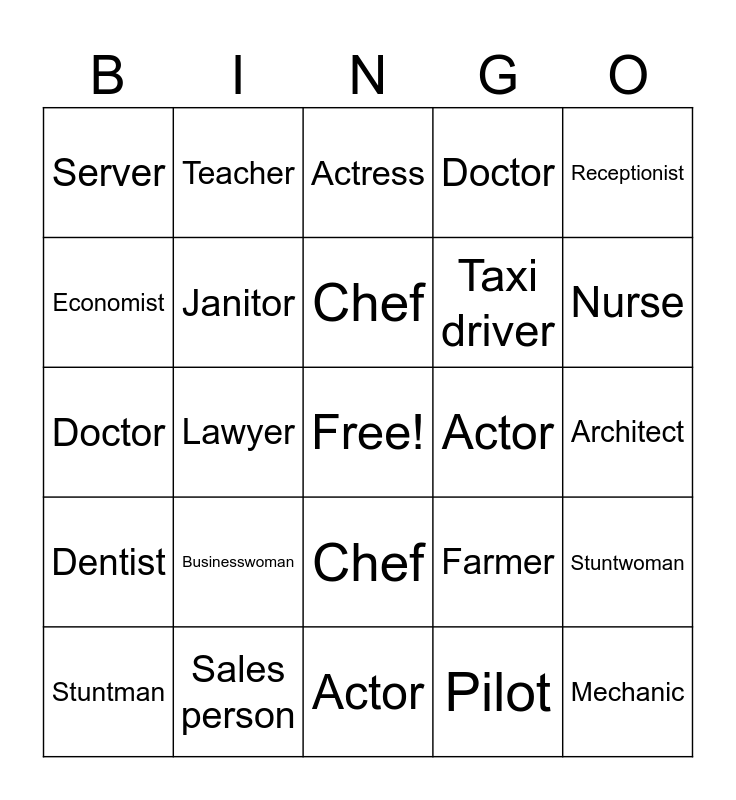 This bingo card has a free space and 58 words: Nurse, Sales person, Police officer, Dentist, Pilot, Engineer, Janitor, Photographer, Taxi driver, Lawyer, Doctor, Businessman, Businesswoman, Tour guide, Farmer, Server, Mechanic, Receptionist, Manager, Chef, Actor, Actress, Stuntman, Stuntwoman, Civil engineer, Architect, Teacher, Professor, Nurse, Sales person, Police officer, Dentist, Pilot, Engineer, Janitor, Photographer, Taxi driver, Lawyer, Doctor, Businessman, Businesswoman, Tour guide, Farmer, Server, Mechanic, Receptionist, Manager, Chef, Actor, Actress, Stuntman, Stuntwoman, Civil engineer, Architect, Teacher, Professor, Economist and Vet.