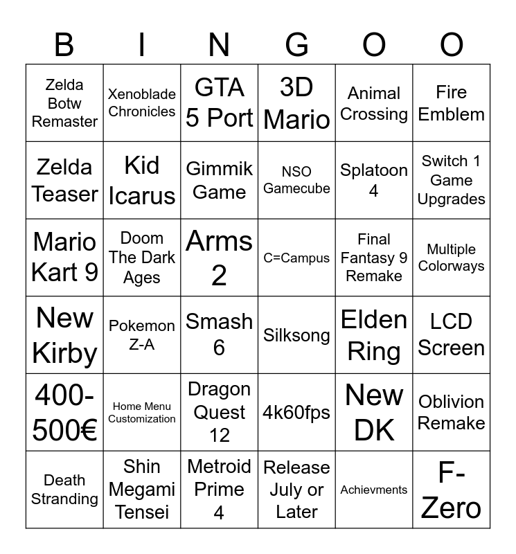 This bingo card has 36 words: 4k60fps, Dragon Quest 12, Release July or Later, Zelda Teaser, New Kirby, C=Campus, Kid Icarus, Metroid Prime 4, Animal Crossing, New DK, Switch 1 Game Upgrades, 3D Mario, Oblivion Remake, Doom The Dark Ages, NSO Gamecube, Zelda Botw Remaster, 400-500€, Final Fantasy 9 Remake, Mario Kart 9, GTA 5 Port, Arms 2, Pokemon Z-A, Silksong, Smash 6, Elden Ring, Xenoblade Chronicles, Splatoon 4, Shin Megami Tensei, Gimmik Game, Fire Emblem, F-Zero, Death Stranding, LCD Screen, Multiple Colorways, Home Menu Customization and Achievments.