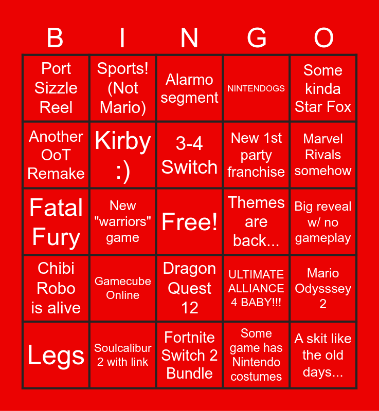 This bingo card has a free space and 24 words: Gamecube Online, Soulcalibur 2 with link, 3-4 Switch, Legs, Some kinda Star Fox, Port Sizzle Reel, Another OoT Remake, Sports! (Not Mario), Themes are back..., Dragon Quest 12, New 1st party franchise, Fatal Fury, ULTIMATE ALLIANCE 4 BABY!!!, Mario Odysssey 2, Kirby :), Some game has Nintendo costumes, Big reveal w/ no gameplay, Alarmo segment, Marvel Rivals somehow, New "warriors" game, A skit like the old days..., Chibi Robo is alive, NINTENDOGS and Fortnite Switch 2 Bundle.