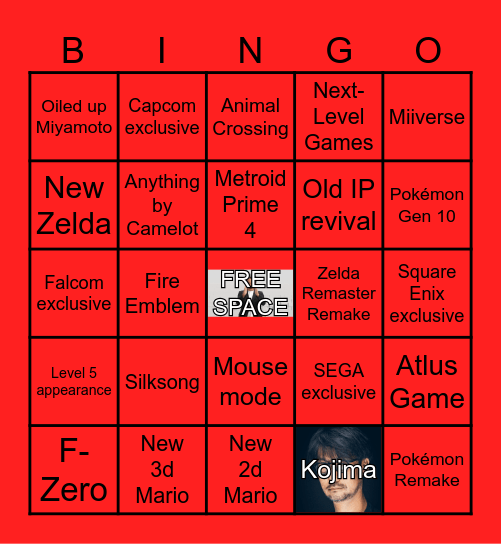 This bingo card has 1 images, a free space and 24 words: Silksong, New 3d Mario, Metroid Prime 4, F-Zero, Miiverse, Oiled up Miyamoto, New Zelda, Capcom exclusive, Zelda Remaster Remake, Mouse mode, Old IP revival, Falcom exclusive, SEGA exclusive, Atlus Game, Anything by Camelot, Kojima, Square Enix exclusive, Animal Crossing, Pokémon Gen 10, Fire Emblem, Pokémon Remake, Level 5 appearance, Next-Level Games and New 2d Mario.