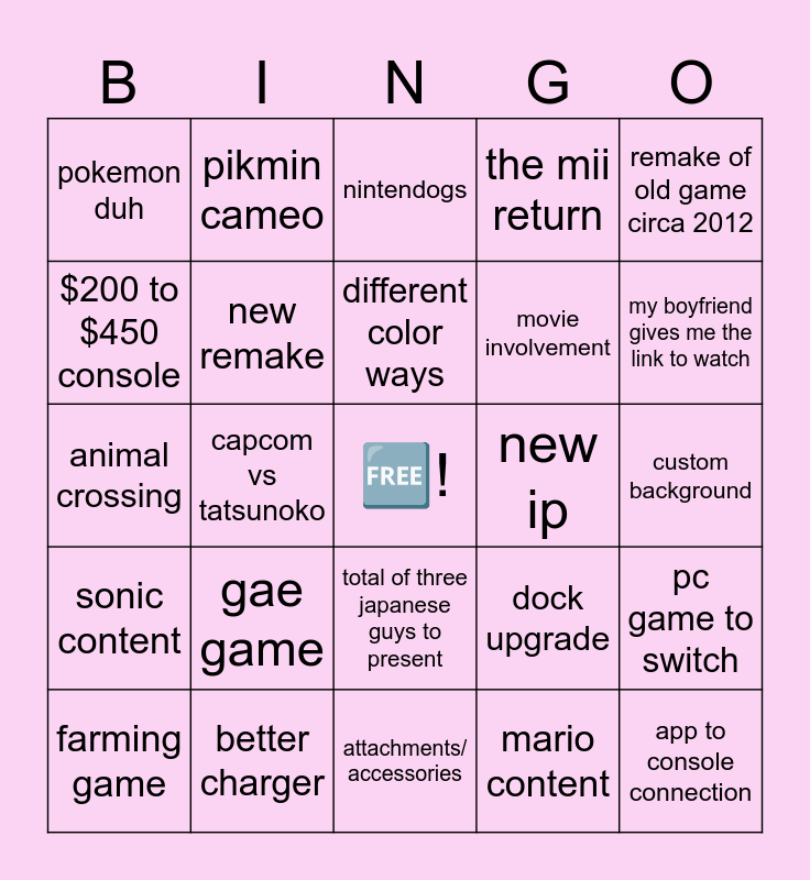 This bingo card has a free space and 24 words: farming game, gae game, different color ways, mario content, remake of old game circa 2012, pokemon duh, pikmin cameo, nintendogs, new ip, custom background, animal crossing, new remake, dock upgrade, pc game to switch, $200 to $450 console, better charger, attachments/ accessories, the mii return, my boyfriend gives me the link to watch, sonic content, capcom vs tatsunoko, total of three japanese guys to present, movie involvement and app to console connection.