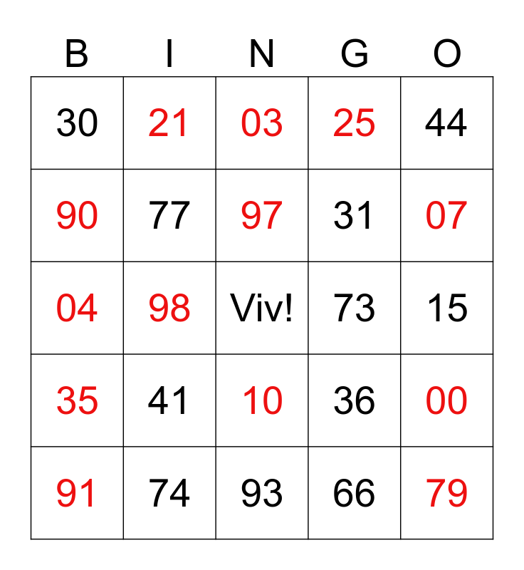 This bingo card has a free space and 28 words: 00, 12, 31, 66, 90, 03, 21, 35, 73, 91, 04, 25, 74, 93, 07, 29, 41, 77, 97, 10, 30, 52, 79, 98, 15, 36, 44 and 61.