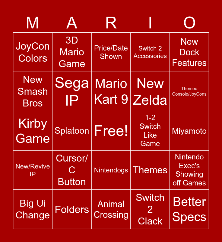 This bingo card has a free space and 24 words: Cursor/ C Button, Folders, Mario Kart 9, Big Ui Change, New Dock Features, JoyCon Colors, New Smash Bros, 3D Mario Game, 1-2 Switch Like Game, Nintendogs, New Zelda, Kirby Game, Themes, Nintendo Exec's Showing off Games, Sega IP, Switch 2 Clack, Miyamoto, Price/Date Shown, Themed Console/JoyCons, Splatoon, Better Specs, New/Revive IP, Switch 2 Accessories and Animal Crossing.