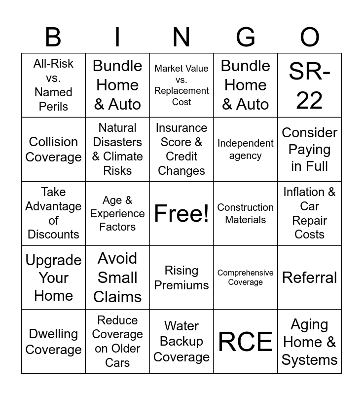 This bingo card has a free space and 24 words: Dwelling Coverage, Avoid Small Claims, Insurance Score & Credit Changes, RCE, SR-22, All-Risk vs. Named Perils, Bundle Home & Auto, Market Value vs. Replacement Cost, Construction Materials, Inflation & Car Repair Costs, Take Advantage of Discounts, Natural Disasters & Climate Risks, Comprehensive Coverage, Referral, Collision Coverage, Reduce Coverage on Older Cars, Water Backup Coverage, Bundle Home & Auto, Consider Paying in Full, Upgrade Your Home, Age & Experience Factors, Rising Premiums, Independent agency and Aging Home & Systems.