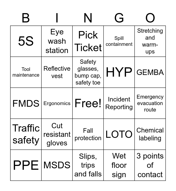 This bingo card has a free space and 24 words: PPE, Cut resistant gloves, Safety glasses, bump cap, safety toe, Wet floor sign, Stretching and warm- ups, 5S, Eye wash station, Pick Ticket, Incident Reporting, Emergency evacuation route, FMDS, Reflective vest, LOTO, Chemical labeling, Tool maintenance, MSDS, Slips, trips and falls, Spill containment, GEMBA, Traffic safety, Ergonomics, Fall protection, HYP and 3 points of contact.