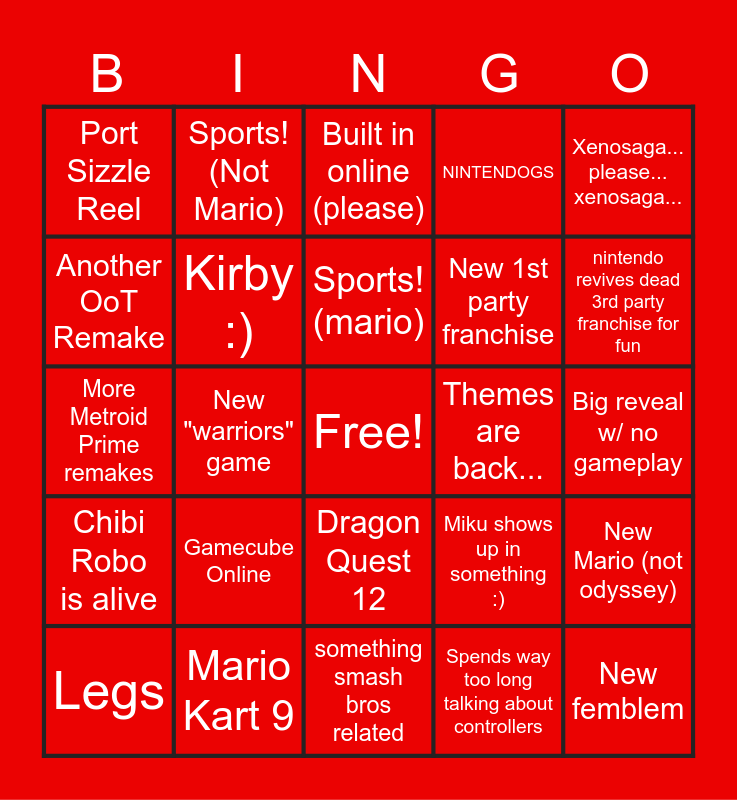 This bingo card has a free space and 24 words: Gamecube Online, Mario Kart 9, Sports! (mario), Legs, Xenosaga... please... xenosaga..., Port Sizzle Reel, Another OoT Remake, Sports! (Not Mario), Themes are back..., Dragon Quest 12, New 1st party franchise, More Metroid Prime remakes, Miku shows up in something :), New Mario (not odyssey), Kirby :), Spends way too long talking about controllers, Big reveal w/ no gameplay, Built in online (please), nintendo revives dead 3rd party franchise for fun, New "warriors" game, New femblem, Chibi Robo is alive, NINTENDOGS and something smash bros related.