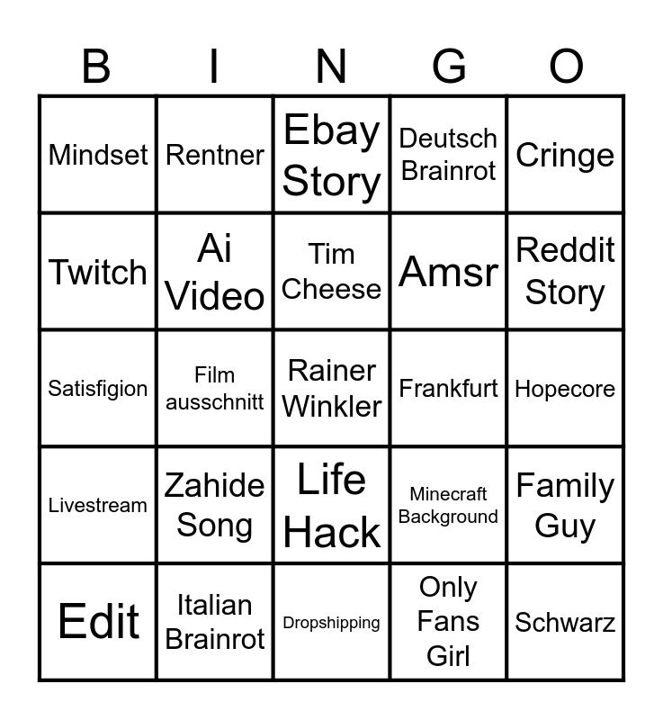 This bingo card has a free space and 24 words: Zahide Song, Italian Brainrot, Tim Cheese, Edit, Cringe, Mindset, Twitch, Rentner, Frankfurt, Life Hack, Amsr, Satisfigion, Minecraft Background, Family Guy, Ai Video, Only Fans Girl, Hopecore, Ebay Story, Reddit Story, Film ausschnitt, Schwarz, Livestream, Deutsch Brainrot and Dropshipping.