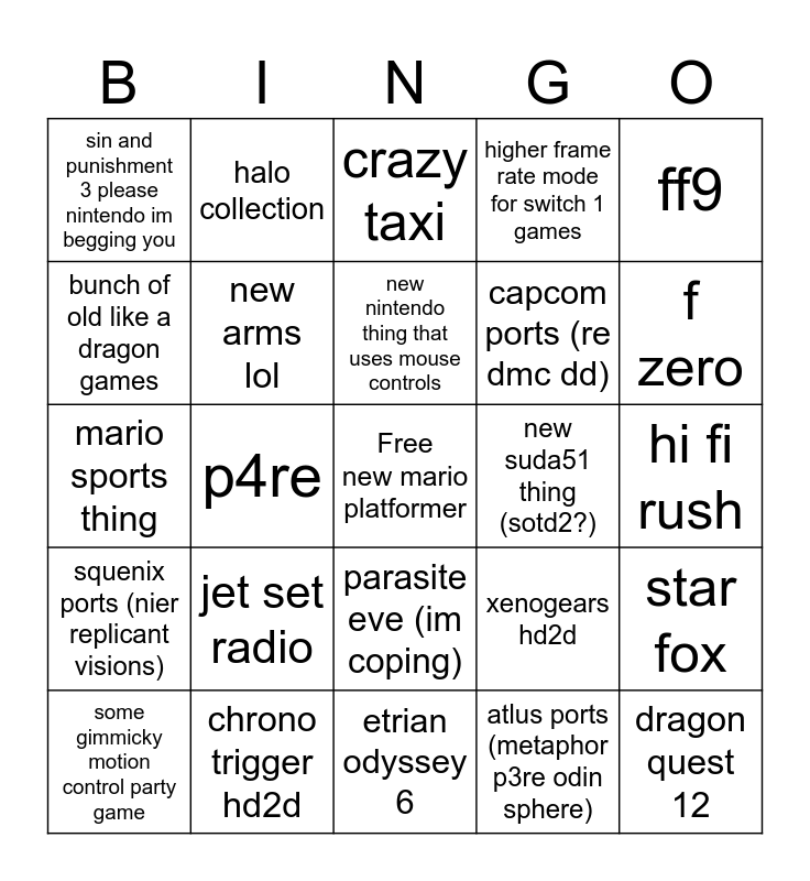 This bingo card has a free space and 24 words: jet set radio, chrono trigger hd2d, new nintendo thing that uses mouse controls, some gimmicky motion control party game, ff9, sin and punishment 3 please nintendo im begging you, bunch of old like a dragon games, halo collection, new suda51 thing (sotd2?), parasite eve (im coping), capcom ports (re dmc dd), mario sports thing, xenogears hd2d, star fox, new arms lol, atlus ports (metaphor p3re odin sphere), hi fi rush, crazy taxi, f zero, p4re, dragon quest 12, squenix ports (nier replicant visions), higher frame rate mode for switch 1 games and etrian odyssey 6.