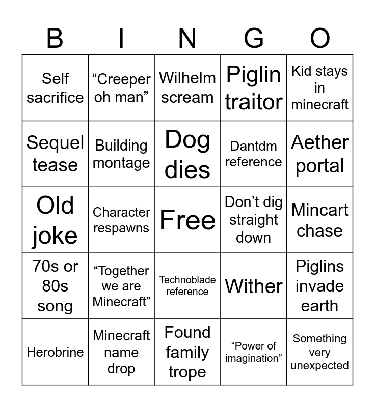 This bingo card has a free space and 24 words: “Together we are Minecraft”, Minecraft name drop, Dog dies, Herobrine, Kid stays in minecraft, Self sacrifice, Sequel tease, “Creeper oh man”, Don’t dig straight down, Technoblade reference, Dantdm reference, Old joke, Wither, Piglins invade earth, Building montage, “Power of imagination”, Mincart chase, Wilhelm scream, Aether portal, Character respawns, Something very unexpected, 70s or 80s song, Piglin traitor and Found family trope.