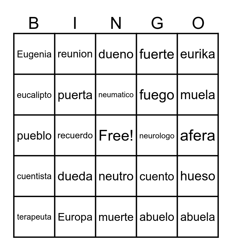 This bingo card has a free space and 24 words: dueda, Europa, neumatico, terapeuta, eurika, Eugenia, eucalipto, reunion, neurologo, neutro, fuego, pueblo, cuento, hueso, puerta, abuelo, afera, dueno, muela, recuerdo, abuela, cuentista, fuerte and muerte.