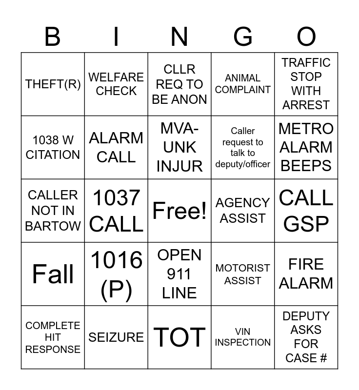 This bingo card has a free space and 49 words: 911 INVEST, DEPUTY ASKS FOR CASE #, SHOTS FIRED CALL, TOT, 1016 (P), 1015(P), WELFARE CHECK, STRUCTURE FIRE, 1038 W CITATION, ROAD OR WATER CALL, ALARM CALL, ANIMAL COMPLAINT, FIRE ALARM, MOTORIST ASSIST, NOISE COMPLAINT, SUPP/ FOLLOW UP, MVA-UNK INJUR, AGENCY ASSIST, MVA-NO INJUR, TRAFFIC STOP WITH ARREST, 1037 CALL, VIN INSPECTION, THEFT(R), Caller request to talk to deputy/officer, 911 HANG UP, METRO ALARM BEEPS, COMPLETE HIT RESPONSE, BOLO, OPEN 911 LINE, Fall, "THIS ISN'T AN EMERGENCY BUT...", DOG BARKING, LIFT ASSIST, Locked out of Veh, SEIZURE, PROPERTY DAMAGE, TREPASS(P), COMPLETE HIT REQUEST, CALL GSP, 1056 SUBJ OR DRIVER, 1096 SUBJ, 1035, EXTRA PATROL, I-75 CALL, CALLER NOT IN BARTOW, CLLR REQ TO BE ANON, ATTEMPT TO LOCATE, SICK CALL and BREATHING PROBLEM.
