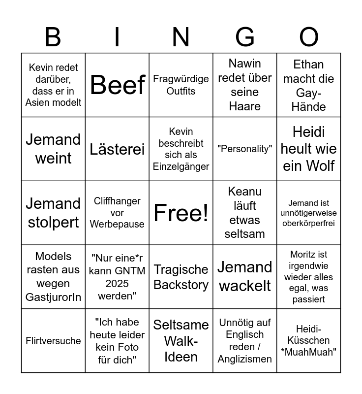This bingo card has a free space and 24 words: "Nur eine*r kann GNTM 2025 werden", "Ich habe heute leider kein Foto für dich", Kevin beschreibt sich als Einzelgänger, Flirtversuche, Ethan macht die Gay-Hände, Kevin redet darüber, dass er in Asien modelt, Jemand weint, Beef, Keanu läuft etwas seltsam, Tragische Backstory, "Personality", Jemand stolpert, Jemand wackelt, Moritz ist irgendwie wieder alles egal, was passiert, Lästerei, Unnötig auf Englisch reden / Anglizismen, Jemand ist unnötigerweise oberkörperfrei, Fragwürdige Outfits, Heidi heult wie ein Wolf, Cliffhanger vor Werbepause, Heidi-Küsschen *MuahMuah", Models rasten aus wegen GastjurorIn, Nawin redet über seine Haare and Seltsame Walk-Ideen.