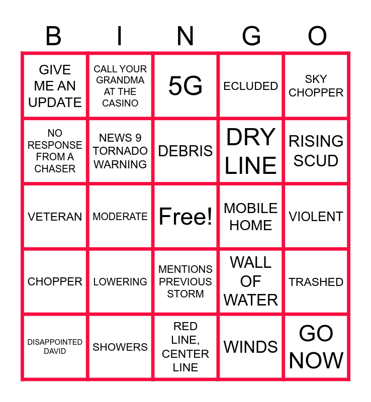 This bingo card has a free space and 260 words: 240, ROLLS UP SLEEVES, 1-44 CORRIDOR, 5G, A TOWN YOU DIDN'T KNOW EXISTED, ACTIVE, ALERT, AREA OF SPIN, ATMOSPHERE, AWAY FROM WINDOWS, BASEMENT, BATHTUB, BE SAFE, BEAR CAGE, BOB MILLS SKYNEWS 9 CHOPPER, BOOKIN' IT, BOOM, BRAUM'S, BRIDGES OR OVERPASSES, CALL YOUR GRANDMA AT THE CASINO, CANADIAN COUNTY, CASINO, CENTER PART, CHECK ON YOUR NEIGHBORS, CHOPPER, CIRCULATION, CLIPPIN' ALONG, CLOUD STRUCTURE, CLOUD-TO-GROUND LIGHTNING, COLD AIR FUNNEL, CONDENSATE, CONTROL ROOM, CRAZY, CROSSING, CURRENCY HAIL, DAMAGE REPORT, DAMAGING WINDS, DANGEROUS, CHEWING FOOD, PUTS ON GLASSES, DEBRIS, DEER CREEK, "TORNADO WARNING" DEFINITION, DEVELOPING, DEW POINT, DISAPPOINTED DAVID, DISORGANIZED, DISSAPATE, DON'T BE THIS GUY, DONUT, DOPPLER RADAR, DRY LINE, ECLUDED, EMERGENCY MANAGEMENT, ENHANCED RISK, FEED/ SHOT, FIRE UP, FLASH FLOOD, FLOODING, FOLKS, FOOD COMPARISON, FORM, FRONT, FUNNEL CLOUD, CONE OR OTHER VARIOUS SHAPE, GET AWAY FROM WINDOWS, GET UNDERGROUND, GETNER, GIVE ME AN UPDATE, GO NOW, GO TO YOUR SAFE SPOT, GOING UP HARD AND FAST, GOLFBALL SIZED HAIL, GRANDMA, GREAT JOB, GREEN SKY, HAIL CORE, HAIL PICS, HAMMERED, HANK, HARD & FAST, HARD TO SEE, HEADS UP, HEAVY RAIN, HELICOPTER REFUELS, HERE WE GO, HEY JIM, HIGH, HIGH PRESSURE, HIGHWAY, HOOK, HOOK ECHO, HOW'S IT LOOKIN' OUT THERE, I LOST (NAME), I-35, I-40, I-44 CORRIDOR, INFLOW, INNERMOST ROOM, INSTABILITY, INTENSIFY, IT'S COMING, IT'S LIVE, THERE IS NO DELAY, IT'S RAMPING UP, IT'S ROTATING, JETSTREAM, JIM GARDNER, KEEP AN EYE ON THIS, KEEP IN MIND, KEEP YOU ADVISED, KINGFISHER COUNTY, LACEY IS NOT ENTERTAINED, LACEY, ZOOM IN ON THE HOOK OF THAT THANG, LARGE HAIL, DAMAGING WINDS, LARGEST TEAM OF TRACKERS, LATE INTO THE NIGHT, LEGIT, LET'S CHECK SHEAR RATE, LET'S GET A VIEW FROM UP TOP, LET'S PUT A TRACK ON THAT, LIGHTNING, LINCOLN COUNTY, LOCKED & LOADED, LONG TRACK, LOWERING, LOWEST LEVEL, LYNX 3, MENTIONS PREVIOUS STORM, MESO, MESOCYCLONE, METRO, MILES, MISPRONOUNCES TOWN NAME, MOBILE HOME, MODERATE, MOORE, MOVING EAST-SOUTHEAST, MOVING UP FROM TEXAS, MULTIPLE TORNADOS, NATIONAL WEATHER SERVICE, NEWS 9 TORNADO WARNING, NEWSROOM, YOU GOT ANY UPDATES?, NEXGEN LIVE, OUR MILLION WATT DUAL-POL RADAR, NICKEL AND DIME, NO RESPONSE FROM A CHASER, NOTHING ACTUALLY HAPPENS, OLUSTEE, SHATTUCK, OR SLAUGHTERVILLE, OMINOUS, ON THE GROUND, OPEN FOR BUSINESS, ORGANIZED, OUTBREAK, PARTICULARLY DANGEROUS SITUATION, PICKING UP, PIEDMONT, PING PONG, POTAWATOMIE COUNTY, POWER FLASHES, POWER GOES OUT, PULL THE CAR INTO THE GARAGE, QUESTIONABLE DRIVING*, RAIN COOLED AIR, RAIN CURTAINS, RAINWRAPPED, RAMPIN' UP, RAPIDLY ROTATING, REAL QUICK, REALLY GETTING LOW, RED LINE, CENTER LINE, REFLECTIVITY, RELATIVE HUMIDITY, RIGHT HERE, RIPPIN', RISING SCUD, ROOFING SPONSOR, ROTATION, SAFE SPOT, SCARY LOOKING CLOUDS, SCREAMING EAGLE, SCUD, SECONDS, SEVERE, SEVERE STORM, SHEER, SHELTER, SHOT OF/FROM HELICOPTER, SHOWERS, SIRENS, SKY CHOPPER, SKYNEWS 9, SO DARK, SOFTBALL, SOUTH BOUND AND DOWN, SOUTHWEST, SPIN, SPIN-UP, SPORT SIZED HAIL, SQUALL LINE, STAY TUNED, WE'LL KEEP YOU ADVISED, STORM CHASER IS YELLING, STORM CHASERS, STORM SHELTER, STORM SURGE, STORMCHASER LOSES AUDIO/VIDEO, STRONG, SUPERCELL, TAG, TAKE COVER NOW, TAKE SHELTER, TALK TO ME VAL, TEMPERATURE, TENNIS BALL, THANK YOU, THAT'S BAD, THE SCUD, THERE'S THE HOOK, THIS IS SERIOUS, TIGER SAFARI ON THE MAP, TIGHTEN UP, TORNADIC ACTIVITY, TORNADO ALLEY, TORNADO ON THE GROUND, TORNADO WARNING, TORNADO WATCH, TRACKERS ARE OUT, TRASHED, TRYON, VICI, OR WAUKOMIS, TURN AROUND DON'T DROWN, UNSTABLE AIR, UPDATE, UPDRAFT, V-NOTCH, VAL & AMY, VAL CASTOR, VELOCITY, VERY DANGEROUS SITUATION, VERY FAST, VETERAN, VIDEO, VIOLENT, VORTICES, WALL CLOUD, WALL OF WATER, WARNING, WATCHING IT, WEAKENING, WEATHER AWARE, WEATHER PRECAUTIONS, WEST, WHAT'S YOUR LOCATION, WHATEVER, WHO'S SHOT IS THAT, WIND SHEAR, WINDS, YEP, YEP, YEP, YEP, YOU CAN'T MAKE THIS STUFF UP, YOU HAVE X MINUTES, YOU SEE SOMEONE WALKING OUTSIDE DURING THE STORM, YOUR COUNTY IS ISSUED A TORNADO WARNING and ZOOM.