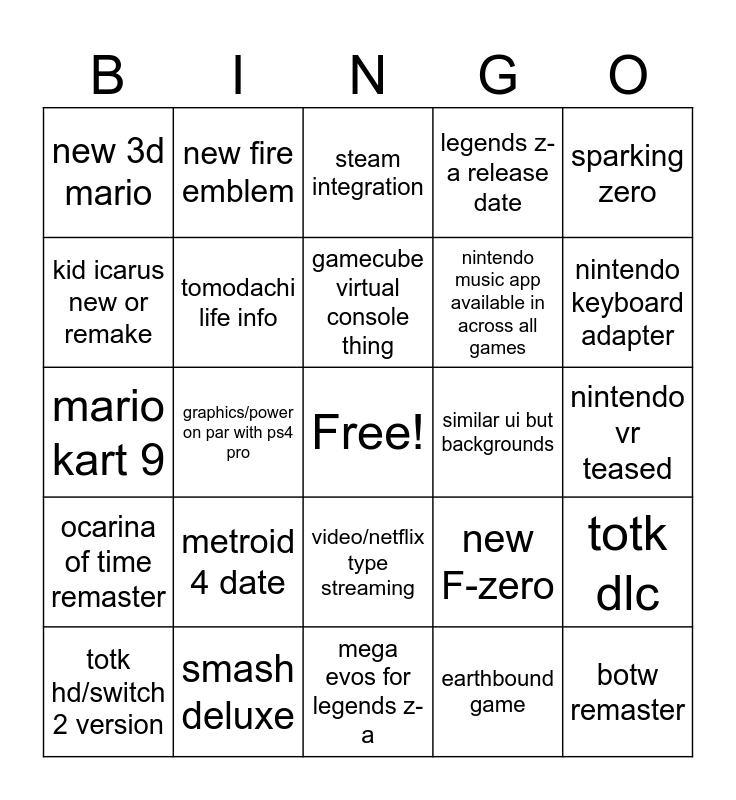 This bingo card has a free space and 24 words: metroid 4 date, smash deluxe, gamecube virtual console thing, totk hd/switch 2 version, sparking zero, new 3d mario, kid icarus new or remake, new fire emblem, similar ui but backgrounds, video/netflix type streaming, nintendo music app available in across all games, mario kart 9, new F-zero, totk dlc, tomodachi life info, earthbound game, nintendo vr teased, steam integration, nintendo keyboard adapter, graphics/power on par with ps4 pro, botw remaster, ocarina of time remaster, legends z-a release date and mega evos for legends z-a.