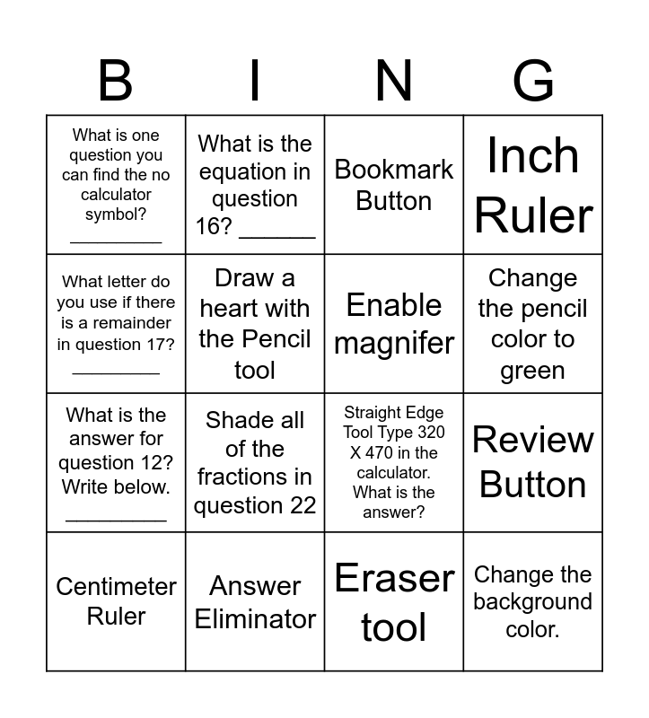 This bingo card has 16 words: Answer Eliminator, Review Button, Bookmark Button, What is one question you can find the no calculator symbol? __________, What is the answer for question 12? Write below. _________, What is the equation in question 16? ______, Straight Edge Tool Type 320 X 470 in the calculator. What is the answer?, Eraser tool, What letter do you use if there is a remainder in question 17? _________, Draw a heart with the Pencil tool, Centimeter Ruler, Inch Ruler, Shade all of the fractions in question 22, Change the pencil color to green, Enable magnifer and Change the background color..