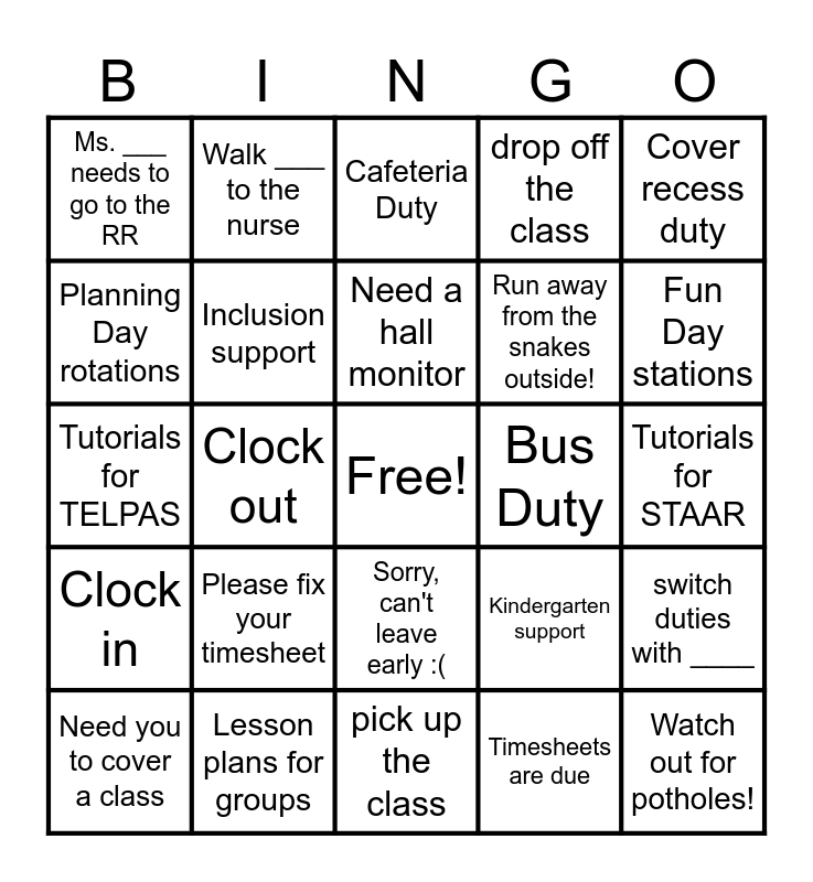 This bingo card has a free space and 24 words: Need you to cover a class, Please fix your timesheet, Need a hall monitor, Timesheets are due, Cover recess duty, Ms. ___ needs to go to the RR, Walk ___ to the nurse, Cafeteria Duty, Bus Duty, Tutorials for STAAR, Tutorials for TELPAS, Inclusion support, Kindergarten support, switch duties with ____, Planning Day rotations, Lesson plans for groups, pick up the class, drop off the class, Fun Day stations, Clock in, Clock out, Sorry, can't leave early :(, Run away from the snakes outside! and Watch out for potholes!.
