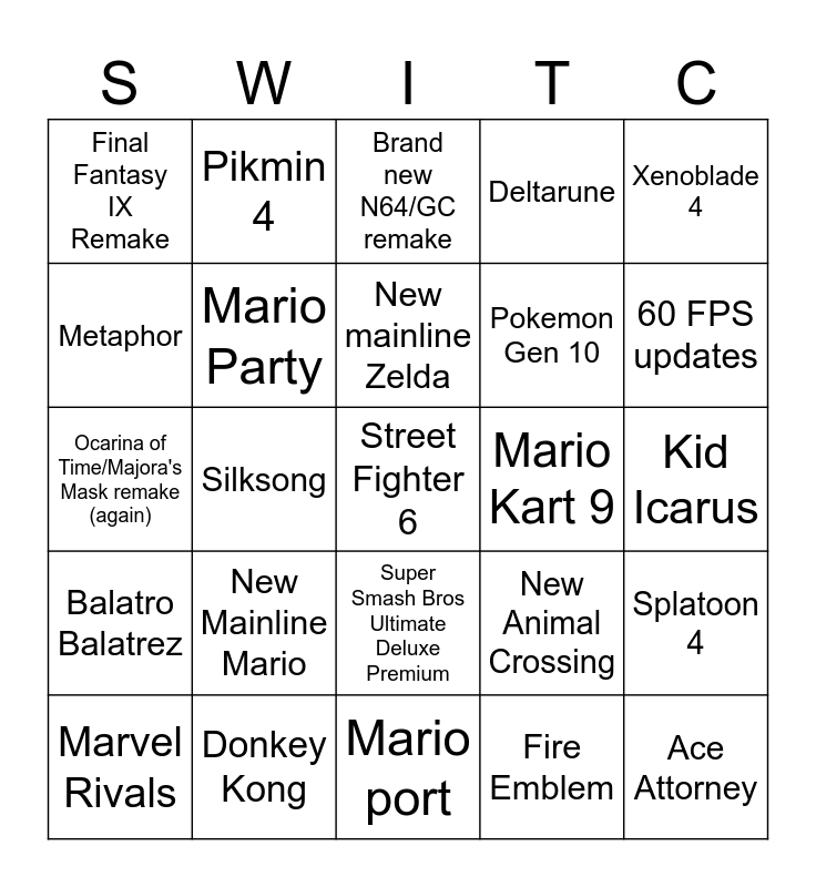 This bingo card has a free space and 24 words: New Mainline Mario, Donkey Kong, New mainline Zelda, Marvel Rivals, Xenoblade 4, Final Fantasy IX Remake, Metaphor, Pikmin 4, Mario Kart 9, Super Smash Bros Ultimate Deluxe Premium, Pokemon Gen 10, Ocarina of Time/Majora's Mask remake (again), New Animal Crossing, Splatoon 4, Mario Party, Fire Emblem, Kid Icarus, Brand new N64/GC remake, 60 FPS updates, Silksong, Ace Attorney, Balatro Balatrez, Deltarune and Mario port.