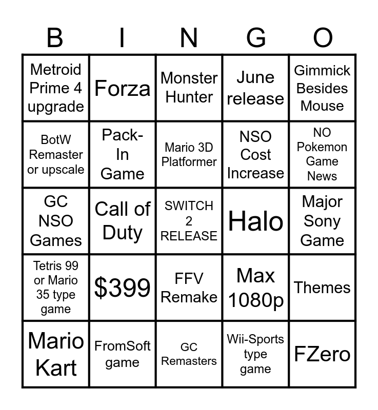 This bingo card has a free space and 24 words: $399, FromSoft game, Mario 3D Platformer, Mario Kart, Gimmick Besides Mouse, Metroid Prime 4 upgrade, BotW Remaster or upscale, Forza, Halo, FFV Remake, NSO Cost Increase, GC NSO Games, Max 1080p, Themes, Pack-In Game, Wii-Sports type game, Major Sony Game, Monster Hunter, NO Pokemon Game News, Call of Duty, FZero, Tetris 99 or Mario 35 type game, June release and GC Remasters.
