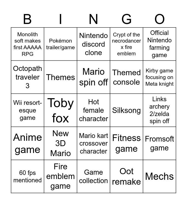 This bingo card has a free space and 24 words: New 3D Mario, Fire emblem game, Mario spin off, 60 fps mentioned, Official Nintendo farming game, Monolith soft makes first AAAAA RPG, Octopath traveler 3, Pokémon trailer/game, Silksong, Mario kart crossover character, Themed console, Wii resort-esque game, Fitness game, Fromsoft game, Themes, Oot remake, Links archery 2/zelda spin off, Nintendo discord clone, Kirby game focusing on Meta knight, Toby fox, Mechs, Anime game, Crypt of the necrodancer x fire emblem and Game collection.