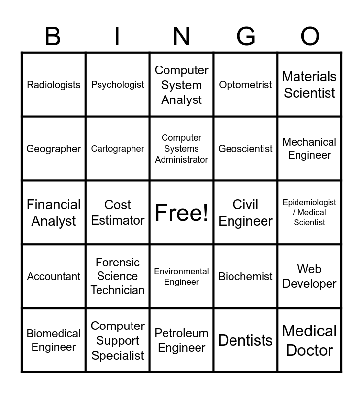 This bingo card has a free space and 24 words: Forensic Science Technician, Computer Support Specialist, Computer Systems Administrator, Biomedical Engineer, Materials Scientist, Radiologists, Geographer, Psychologist, Civil Engineer, Environmental Engineer, Geoscientist, Financial Analyst, Biochemist, Web Developer, Cartographer, Dentists, Epidemiologist / Medical Scientist, Computer System Analyst, Mechanical Engineer, Cost Estimator, Medical Doctor, Accountant, Optometrist and Petroleum Engineer.