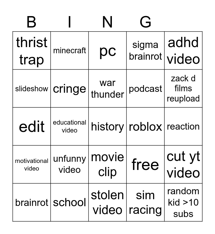 This bingo card has 25 words: unfunny video, stolen video, war thunder, brainrot, adhd video, thrist trap, slideshow, minecraft, roblox, movie clip, podcast, edit, free, cut yt video, cringe, random kid >10 subs, reaction, pc, zack d films reupload, educational video, history, school, motivational video, sigma brainrot and sim racing.