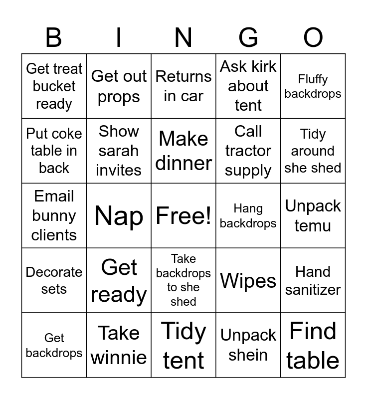 This bingo card has a free space and 24 words: Get ready, Take winnie, Make dinner, Get backdrops, Fluffy backdrops, Get treat bucket ready, Put coke table in back, Get out props, Hang backdrops, Take backdrops to she shed, Call tractor supply, Email bunny clients, Wipes, Hand sanitizer, Show sarah invites, Unpack shein, Unpack temu, Returns in car, Tidy around she shed, Nap, Find table, Decorate sets, Ask kirk about tent and Tidy tent.