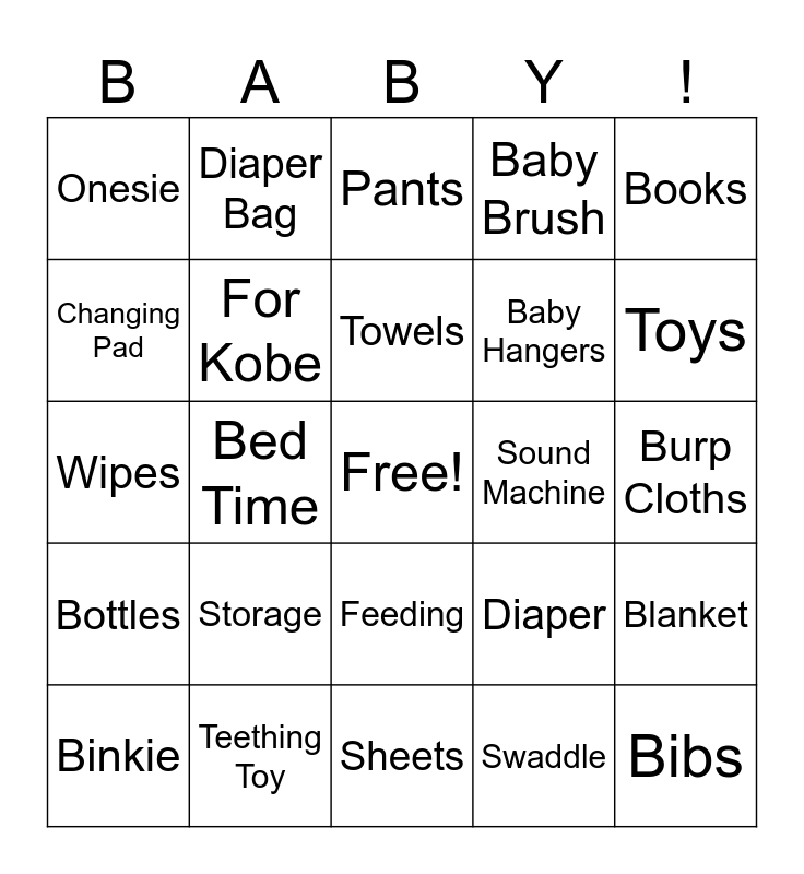 This bingo card has a free space and 30 words: Teething Toy, Bath Time, Bed Time, Stroller, Onesie, Pants, For Kobe, Feeding, Sound Machine, Sheets, Burp Cloths, Bibs, Swaddle, Aquaphor, Toys, Play Mat, Diaper, Bottles, Storage, Books, Wipes, Hat, Diaper Bag, Baby Hangers, Changing Pad, Baby Brush, Blanket, Binkie, Towels and Sling or Carrier.