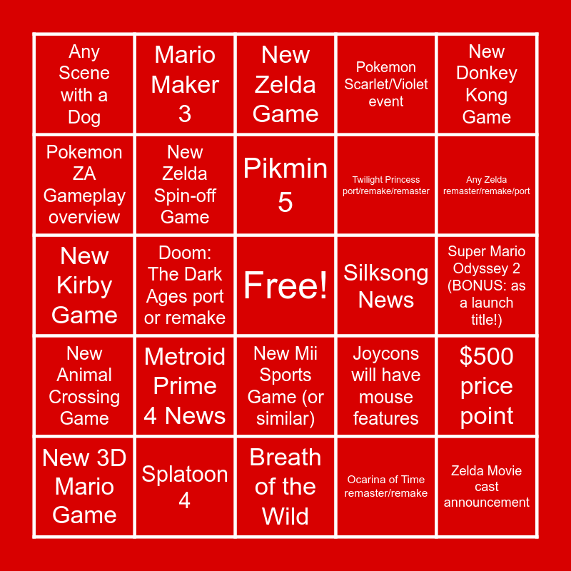 This bingo card has a free space and 29 words: New 3D Mario Game, More Mario Kart 9 News, Doom: The Dark Ages port or remake, 2D Metroid Game, Any Scene with a Dog, New Zelda Game, New Zelda Spin-off Game, Metroid Prime 4 News, Silksong News, Splatoon 4, Super Mario Odyssey 2 (BONUS: as a launch title!), Zelda Movie cast announcement, Breath of the Wild, Ocarina of Time remaster/remake, Any Zelda remaster/remake/port, Super Smash Bros 6, New Mii Sports Game (or similar), New Animal Crossing Game, New Donkey Kong Game, New Kirby Game, Joycons will have mouse features, Wind Waker port/remake/remaster, Twilight Princess port/remake/remaster, Pokemon ZA Gameplay overview, Pokemon Scarlet/Violet event, Mario Maker 3, $500 price point, Pikmin 5 and Virtual Console announcement.