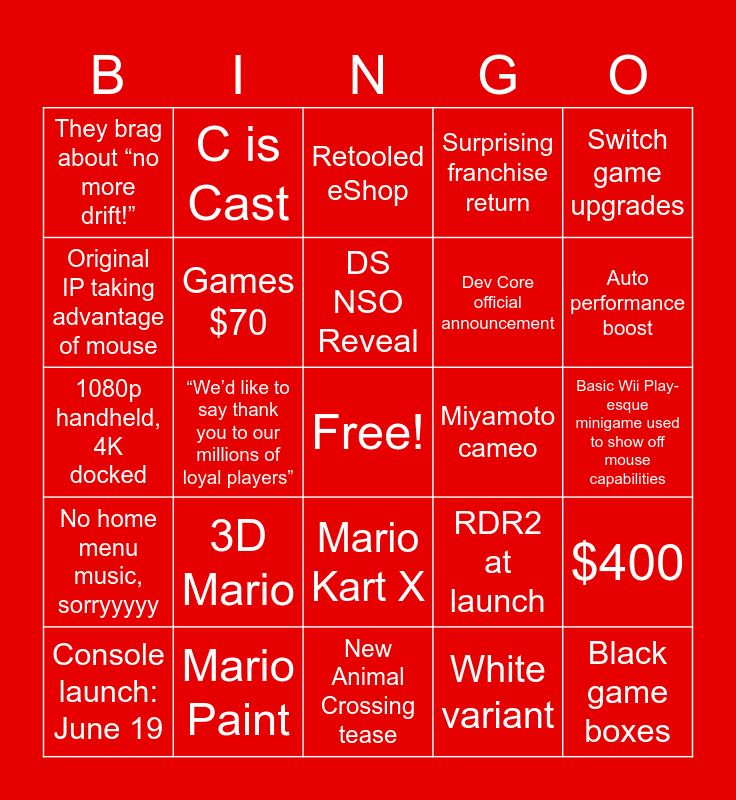 This bingo card has a free space and 24 words: 3D Mario, Mario Paint, DS NSO Reveal, Console launch: June 19, Switch game upgrades, They brag about “no more drift!”, Original IP taking advantage of mouse, C is Cast, Miyamoto cameo, Mario Kart X, Dev Core official announcement, 1080p handheld, 4K docked, RDR2 at launch, $400, Games $70, White variant, Basic Wii Play-esque minigame used to show off mouse capabilities, Retooled eShop, Auto performance boost, “We’d like to say thank you to our millions of loyal players”, Black game boxes, No home menu music, sorryyyyy, Surprising franchise return and New Animal Crossing tease.
