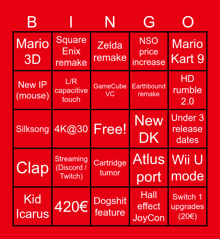 This bingo card has a free space and 24 words: Streaming (Discord / Twitch), 420€, GameCube VC, Kid Icarus, Mario Kart 9, Mario 3D, New IP (mouse), Square Enix remake, New DK, Cartridge tumor, Earthbound remake, Silksong, Atlus port, Wii U mode, L/R capacitive touch, Hall effect JoyCon, Under 3 release dates, Zelda remake, HD rumble 2.0, 4K@30, Switch 1 upgrades (20€), Clap, NSO price increase and Dogshit feature.